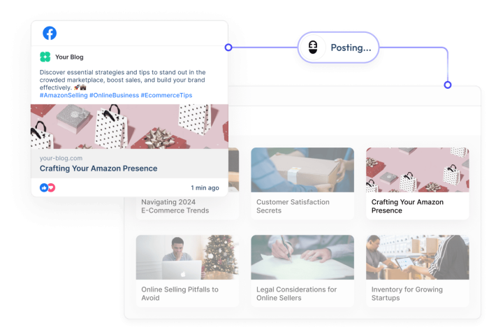 It automatically generates and publishes a social media post with engaging copy and images based on the published blog post