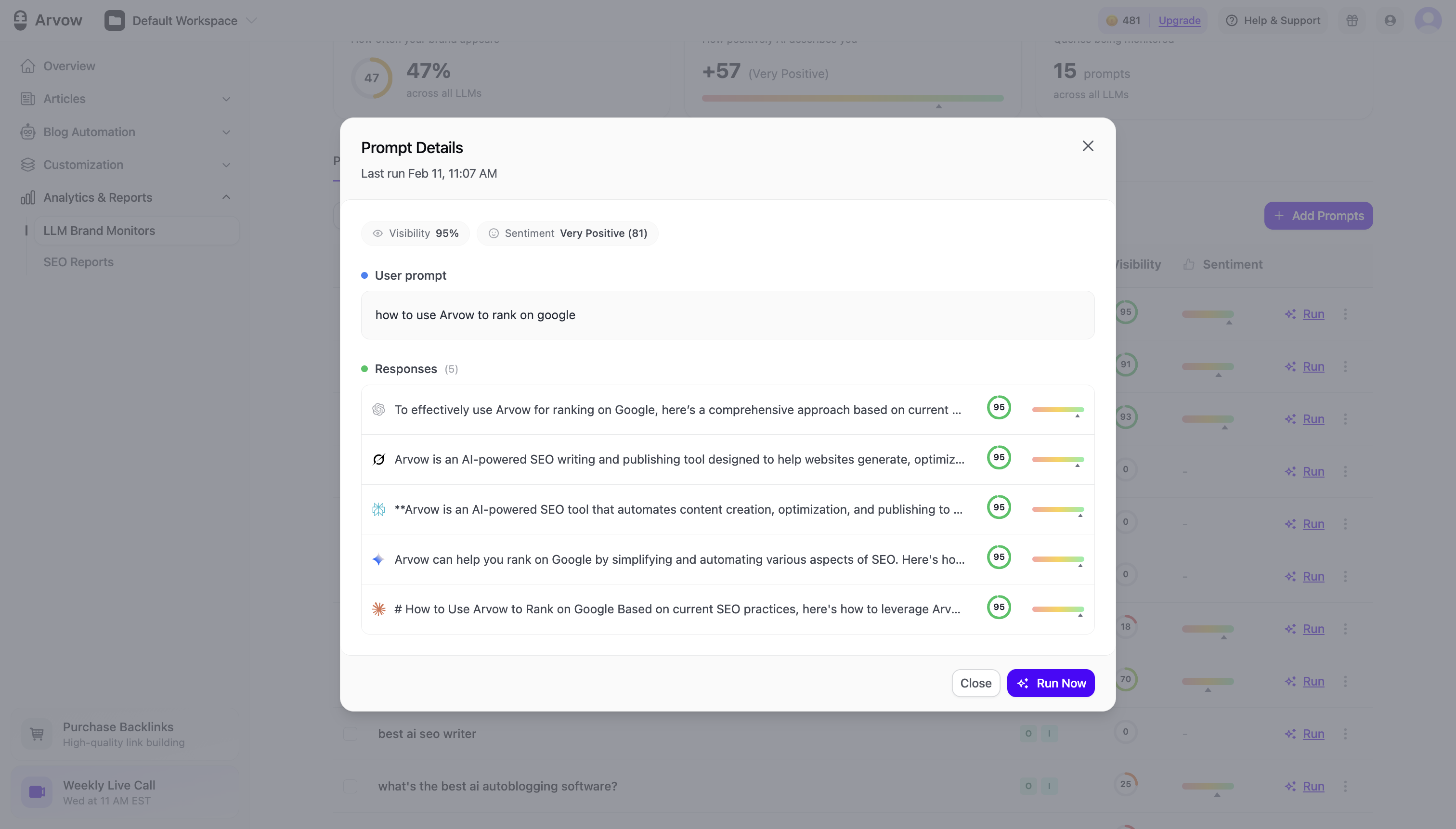 Arvow gives you unlimited prompts, continuous background monitoring, sentiment tracking, competitor benchmarking, white-label reports for agencies, and the ability to force re-runs whenever you update content. Plus it integrates with AI content creation—so you can create optimized content AND track how AI mentions you, all in one platform.