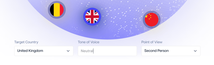 Write content in 150+ languages. Write in a Correct/Factual manner, all the way to Creative/Original. Apply a specific tonality, such as informal or persuasive. Choose a target country to generate location-specific content. Change POV, Formality and more.